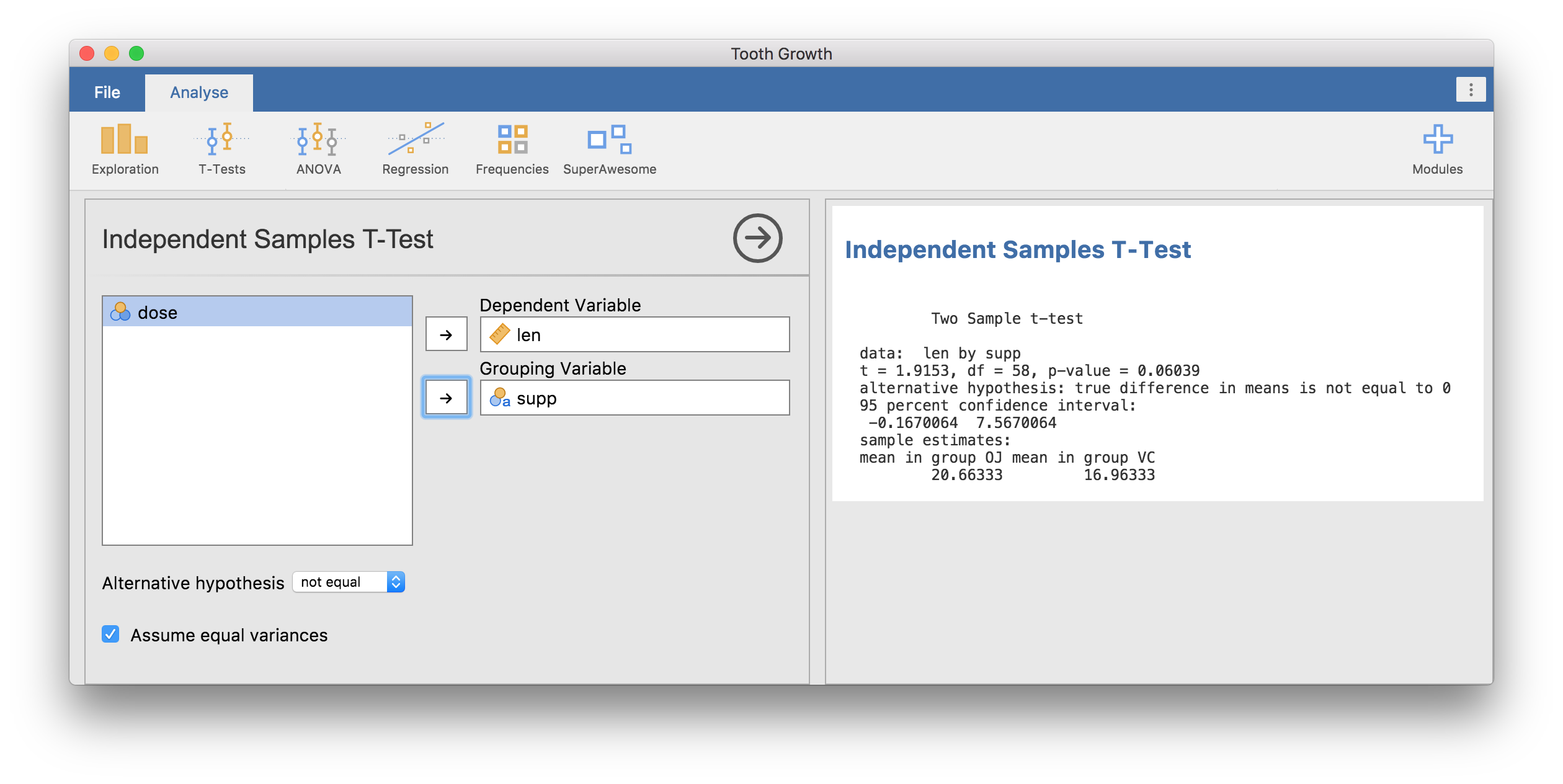 ttest(data=ToothGrowth, dep='len', group='supp')