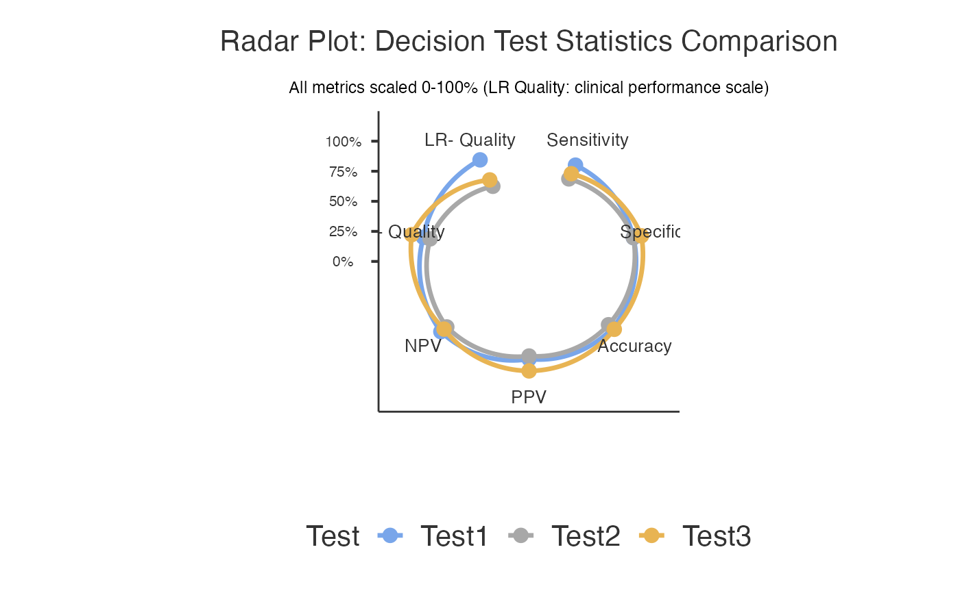 Demonstrates three-way comparison with complementary test characteristics. Ideal for radar plot visualization and comprehensive test evaluation.