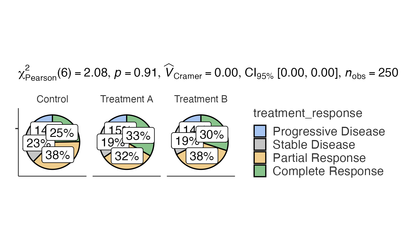 #> Pie chart analysis ready Variable: treatment_response, grouped by