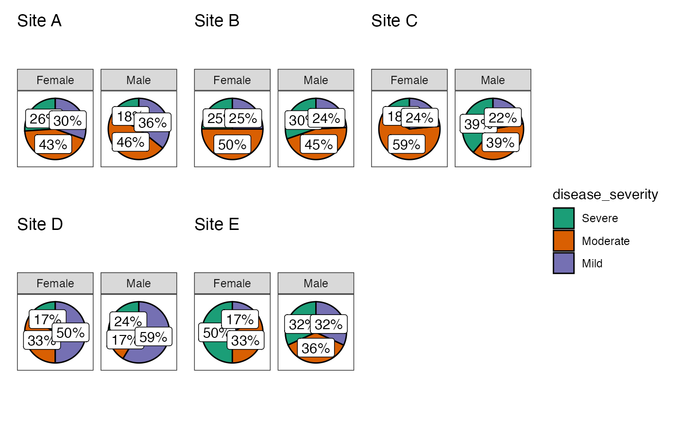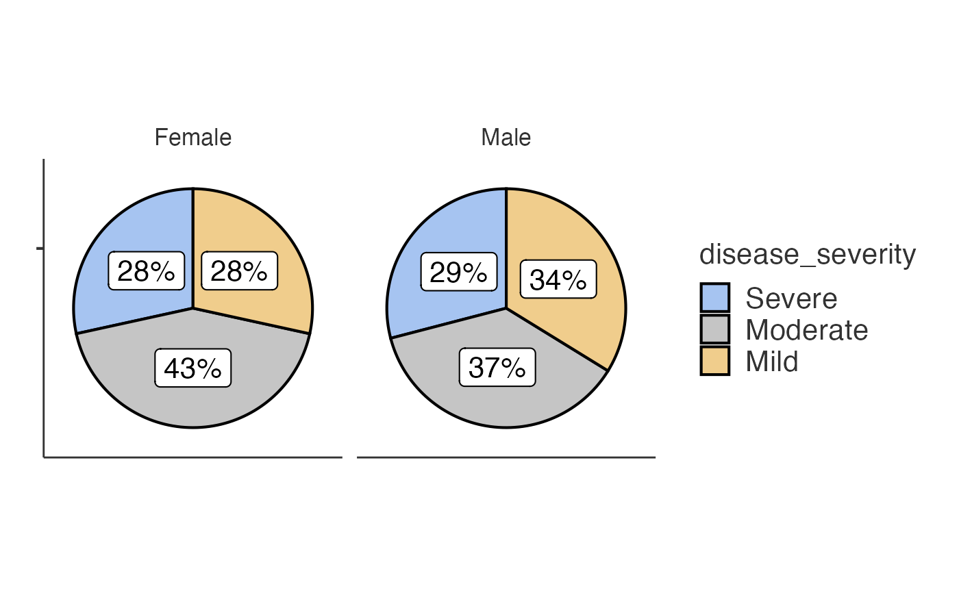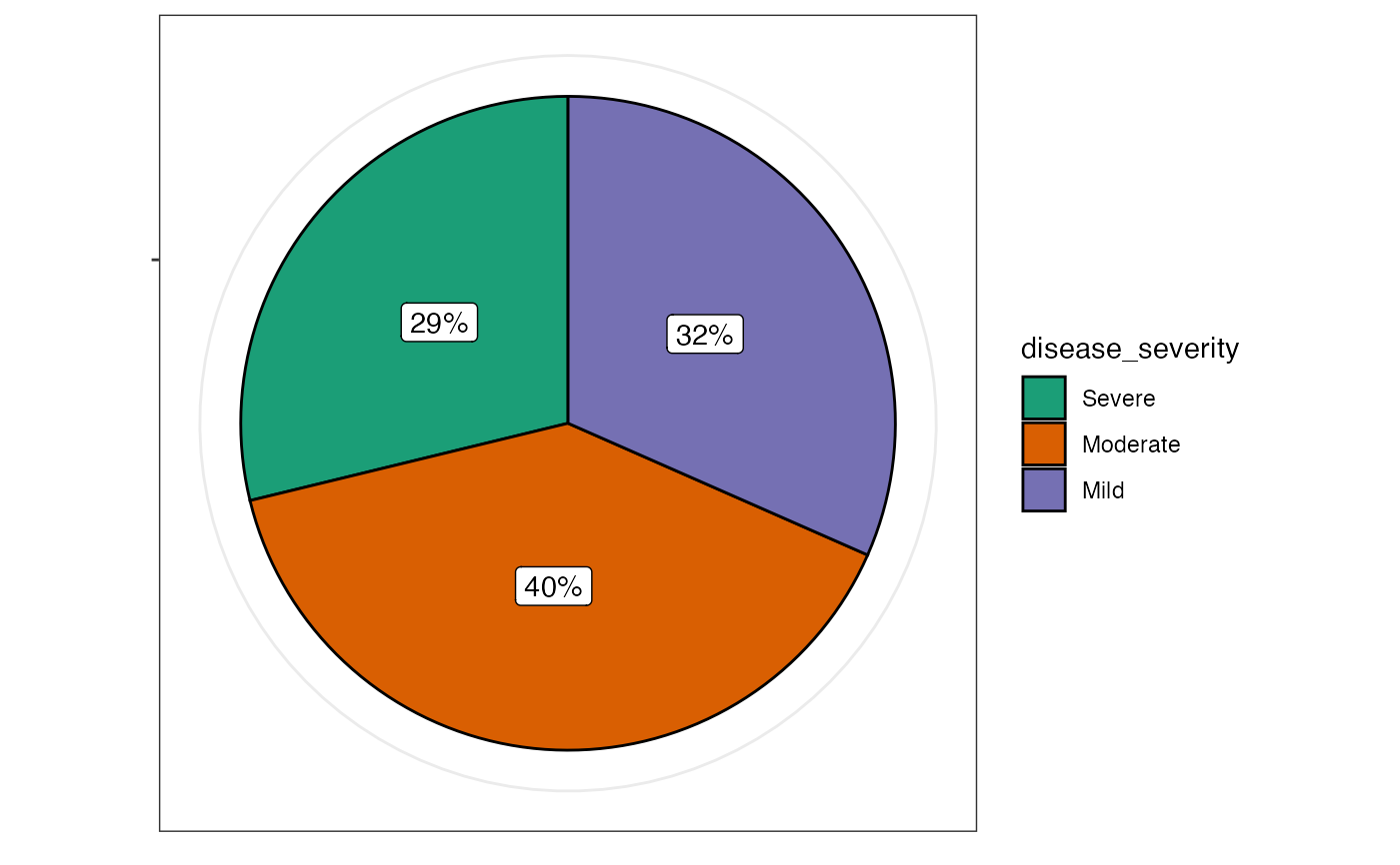 #> Pie chart analysis ready Variable: disease_severity, grouped by