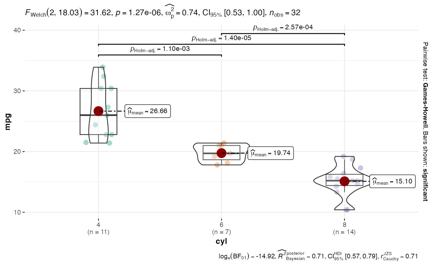 #> Variables: mpg (continuous) vs cyl (factor)