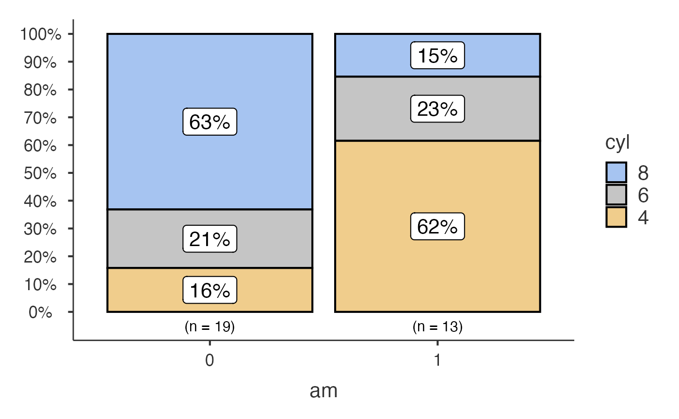 jjbarstats(data = mtcars, dep = cyl, group = am, grvar = NULL)