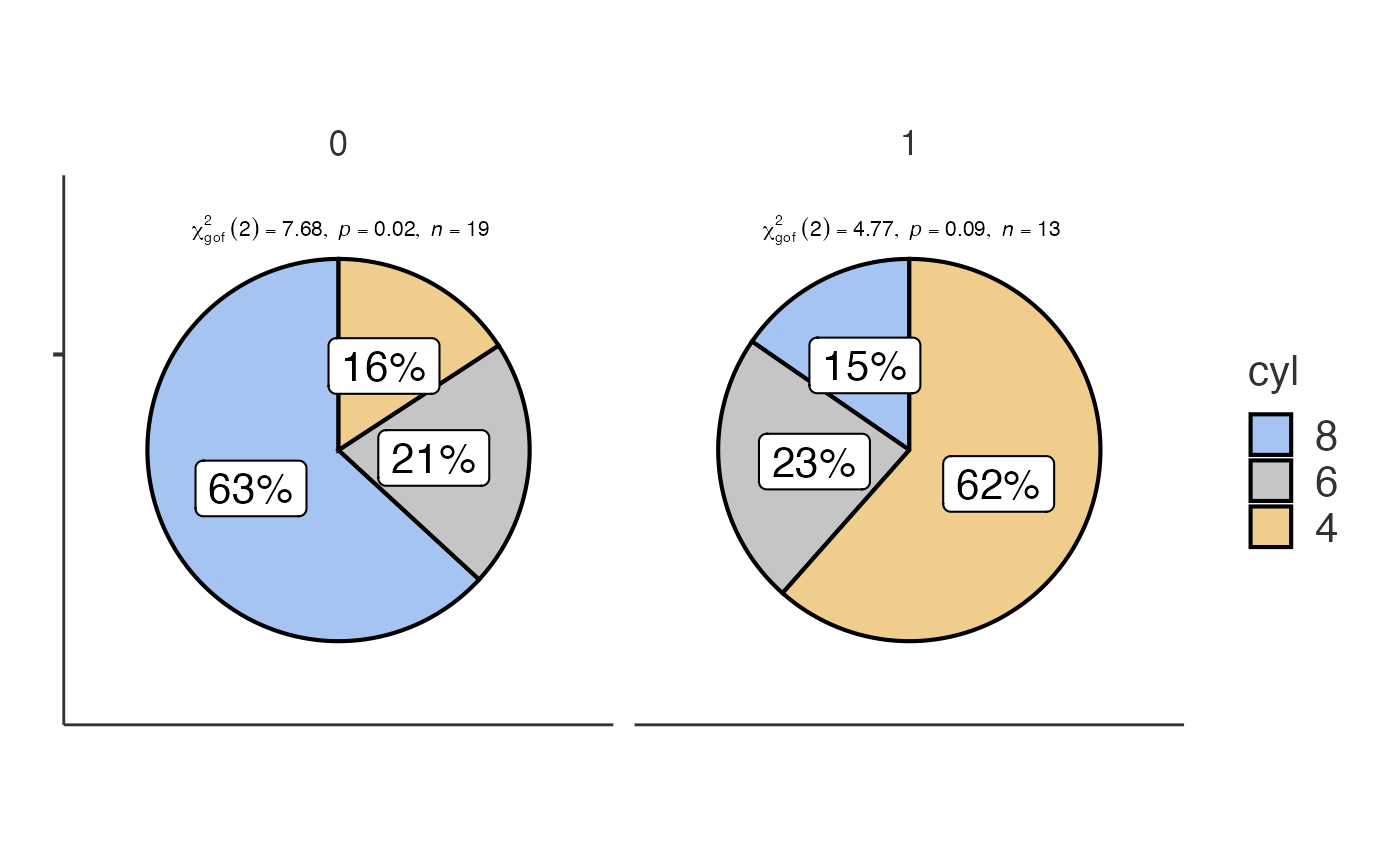 jjpiestats(data = mtcars, dep = cyl, group = am, grvar = NULL)