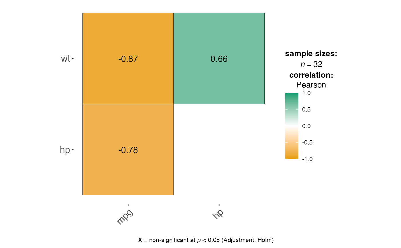 jjcorrmat(data = mtcars, dep = c(mpg, hp, wt), grvar = NULL)