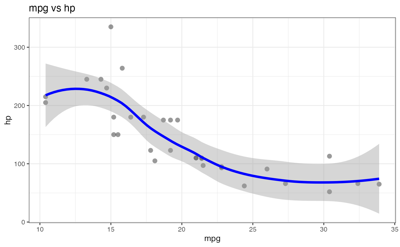 jjscatterstats(data = mtcars, dep = mpg, group = hp, grvar = NULL)