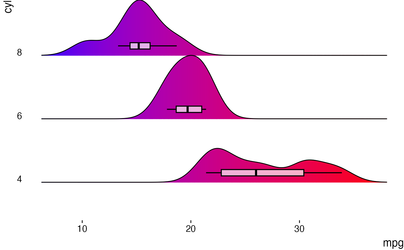 #> Analysis: Ridge plot comparing the distribution of mpg across 3 groups