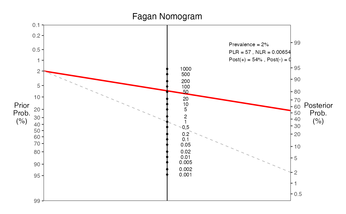 #> specificity 90%) in a population with 2.0% disease prevalence showed: